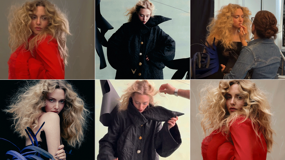 Next up, Seyfried's makeup. Herr tells me that she was especially inspired by the clothing choices for the shoot, which felt avant-garde and structured. Ultimately, she chose a makeup look that would complement the moodiness of the design and color palette.