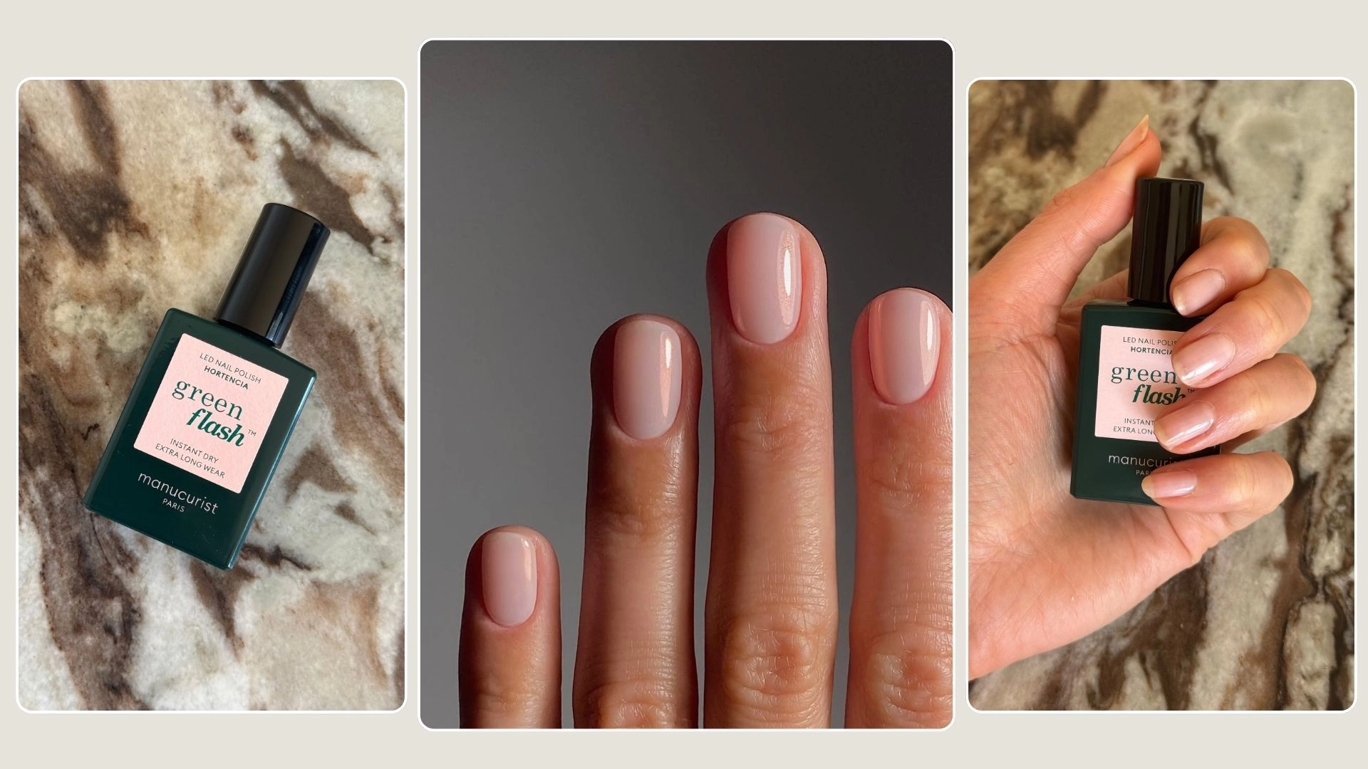 One coat is almost clear, and two adds a tint of pink, but for me, three coats is the sweet spot for a slightly milkier pink finish. It comes in both Manucurist's regular nail polish and in the Green Flash formula, which is a gel nail alternative that you "cure" with the Manucurist Green Flash LED lamp for a longer-lasting, gel-like manicure.