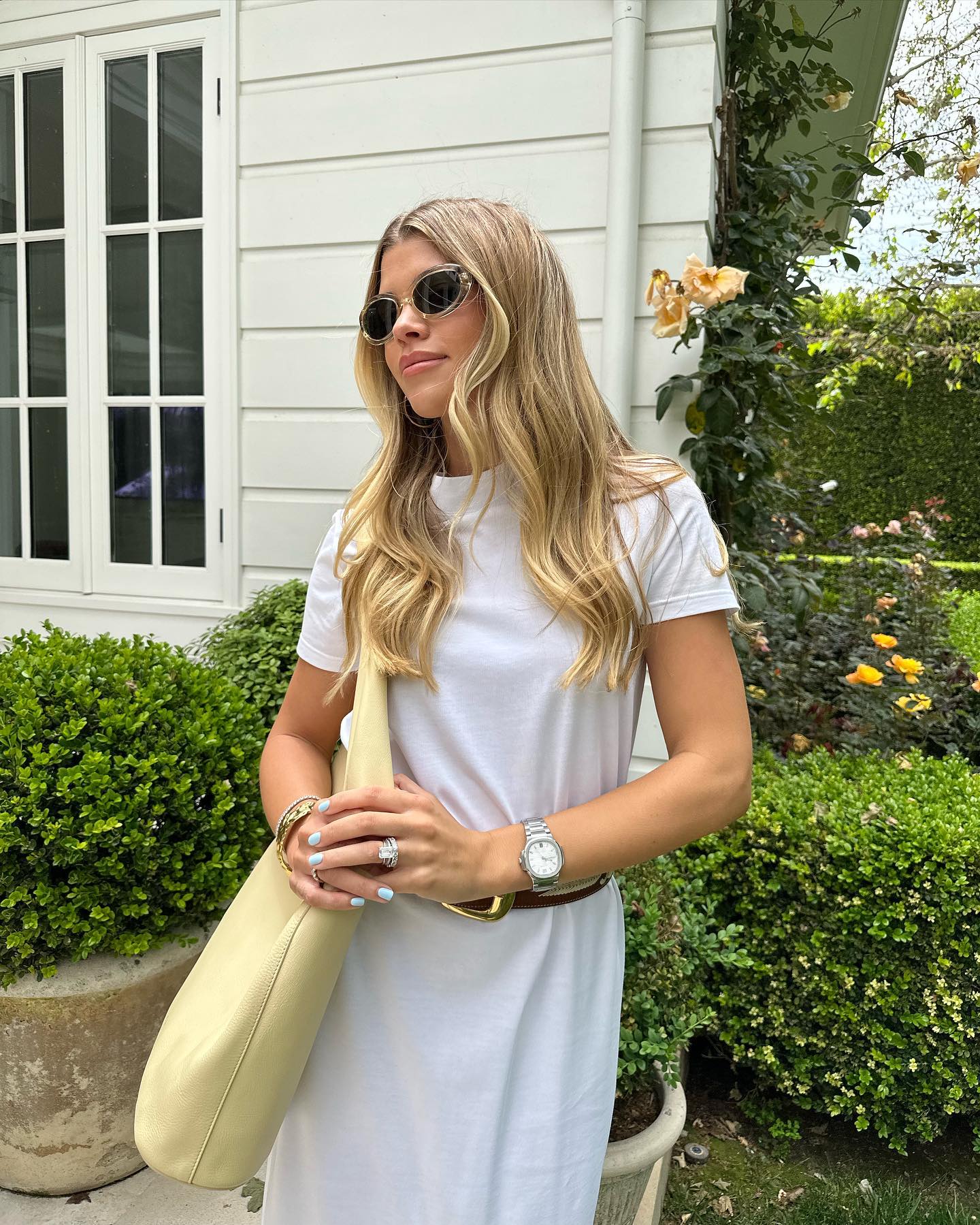 On Sofia Richie Grainge: The Row dress and bag; Khaite x Oliver Peoples sunglasses; Patek Philippe Nautilus Watch