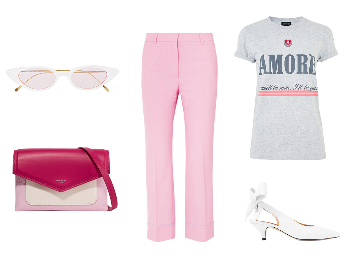 A light gray tee matches perfectly with pink.Available in sizes S to L.