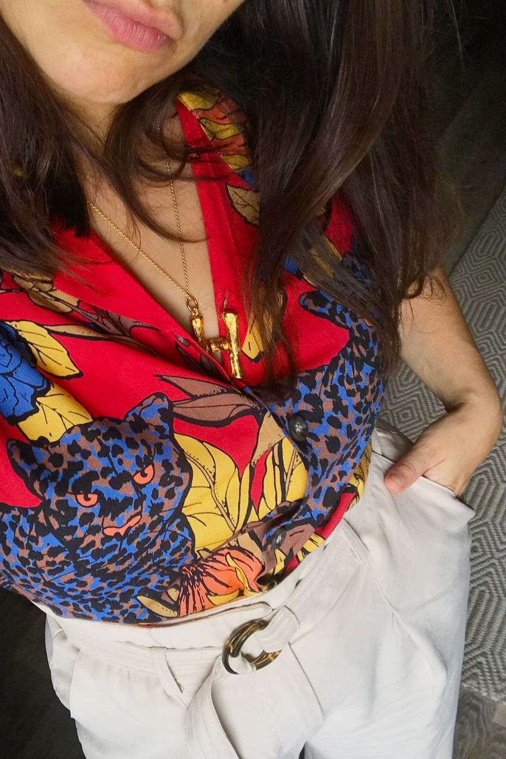 Style Notes: Hannah Almassi wears Topman's red panther-printed shirt tucked into high-waisted chino trousers.