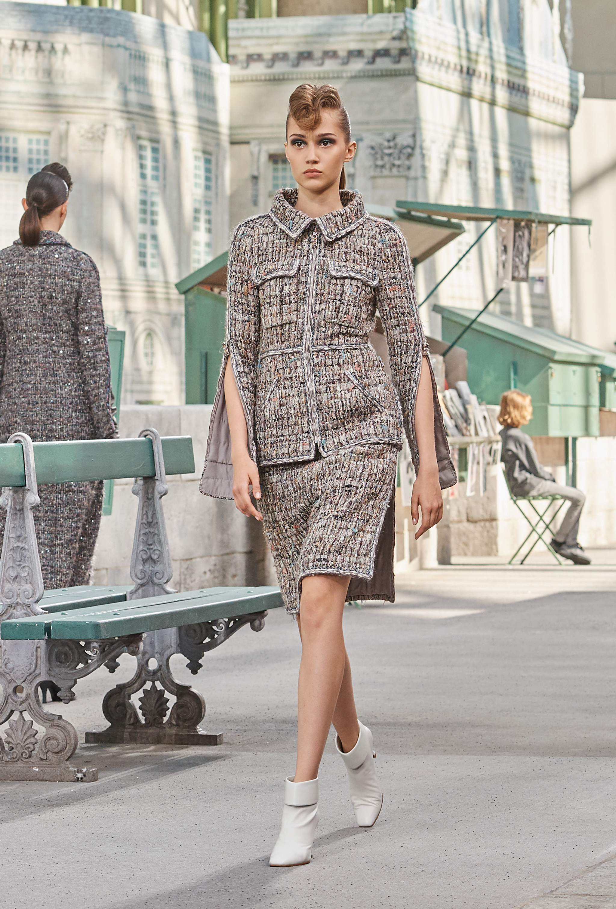 Leave it to Karl Lagerfeld to re-create a stretch of the Seine right within Paris itself. When I first caught glimpses of the Chanel Couture show, shot against green benches and open-air bookstalls and charming street corners, I thought the show had been taken to the streets of Paris itself. But it wouldn’t be a Chanel show without an impressive runway set, and for this one, Lagerfeld decided to create a Parisian promenade and some of the city’s famous landmarks to bring the sights and sounds of Paris within the walls of the Grand Palais. The show was an obvious homage to the city of Paris itself.