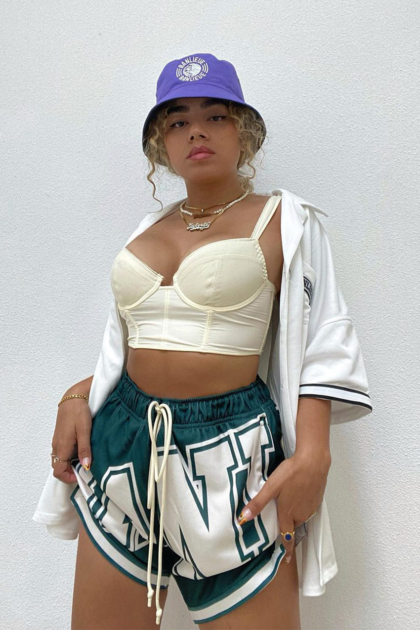 Corset Top + Basket Ball Shorts + Sports Jersey + Bucket Hat + Layered Jewelry