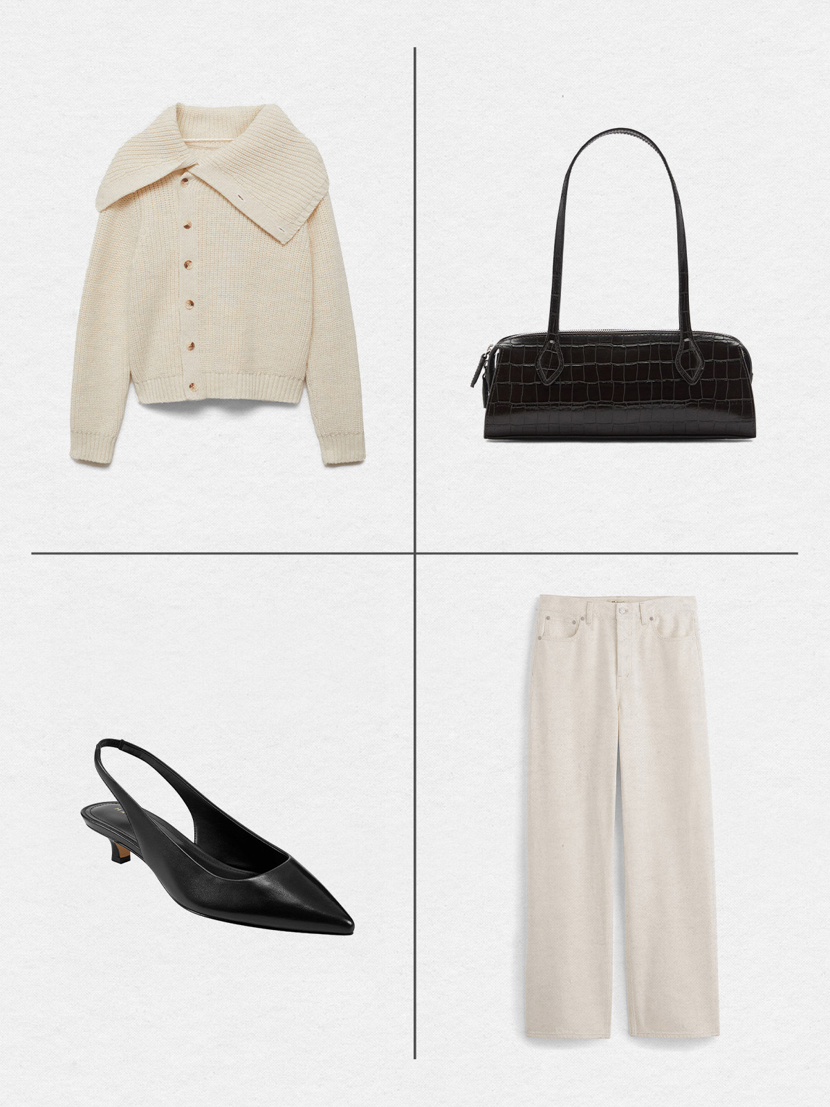 Off-white jeans and an elevated ivory sweater combined with black polished kitten heels and an east-west bag is a gorgeous look for everything from meetings to cozy dinner dates.