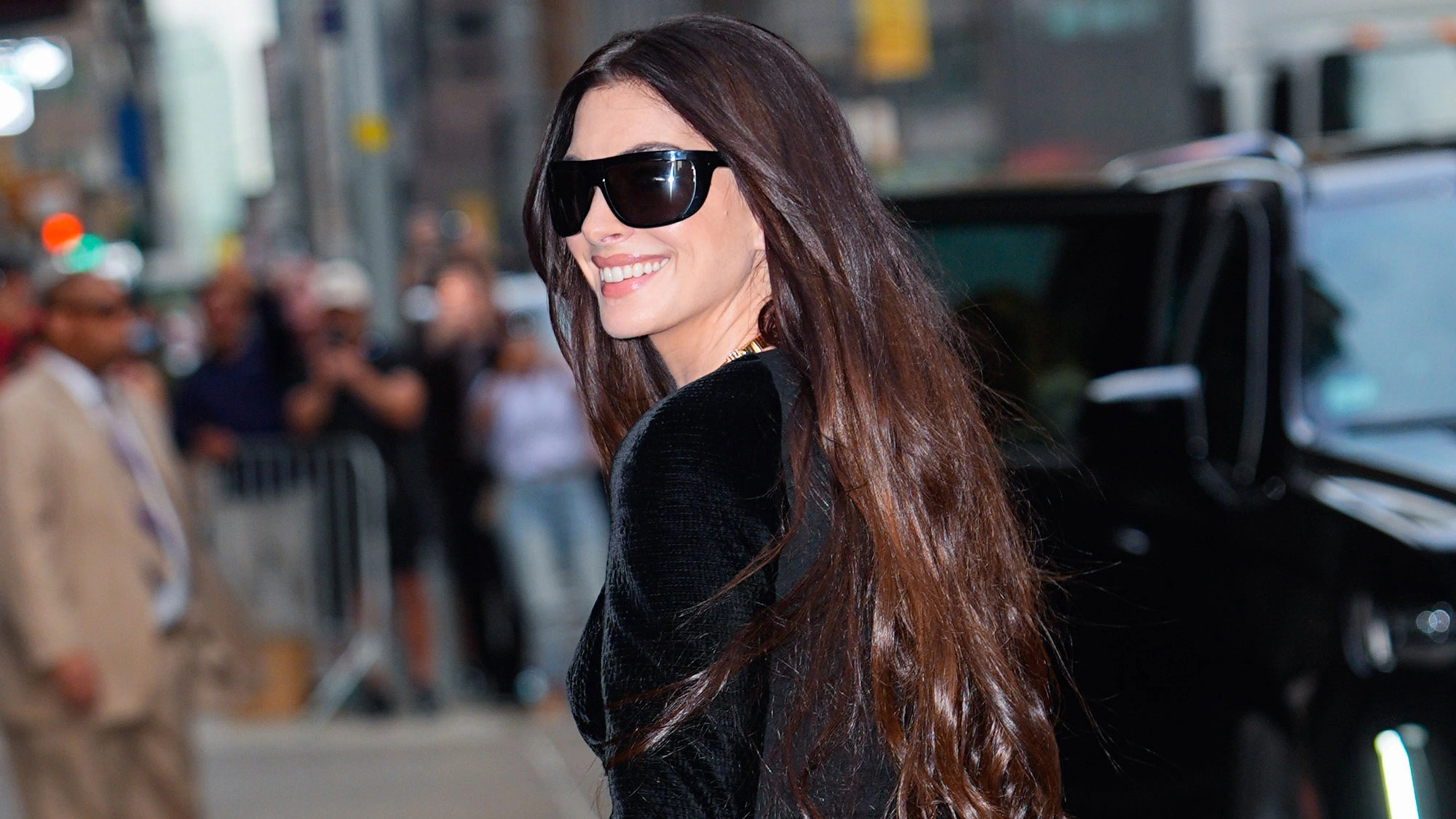 On Anne Hathaway: Sacai coat; Dolce & Gabbana trousers; Versace shoes; Bulgari jewelry; Khaite x Oliver Peoples sunglasses; DeMellier New York Shoulder Bag ($396)