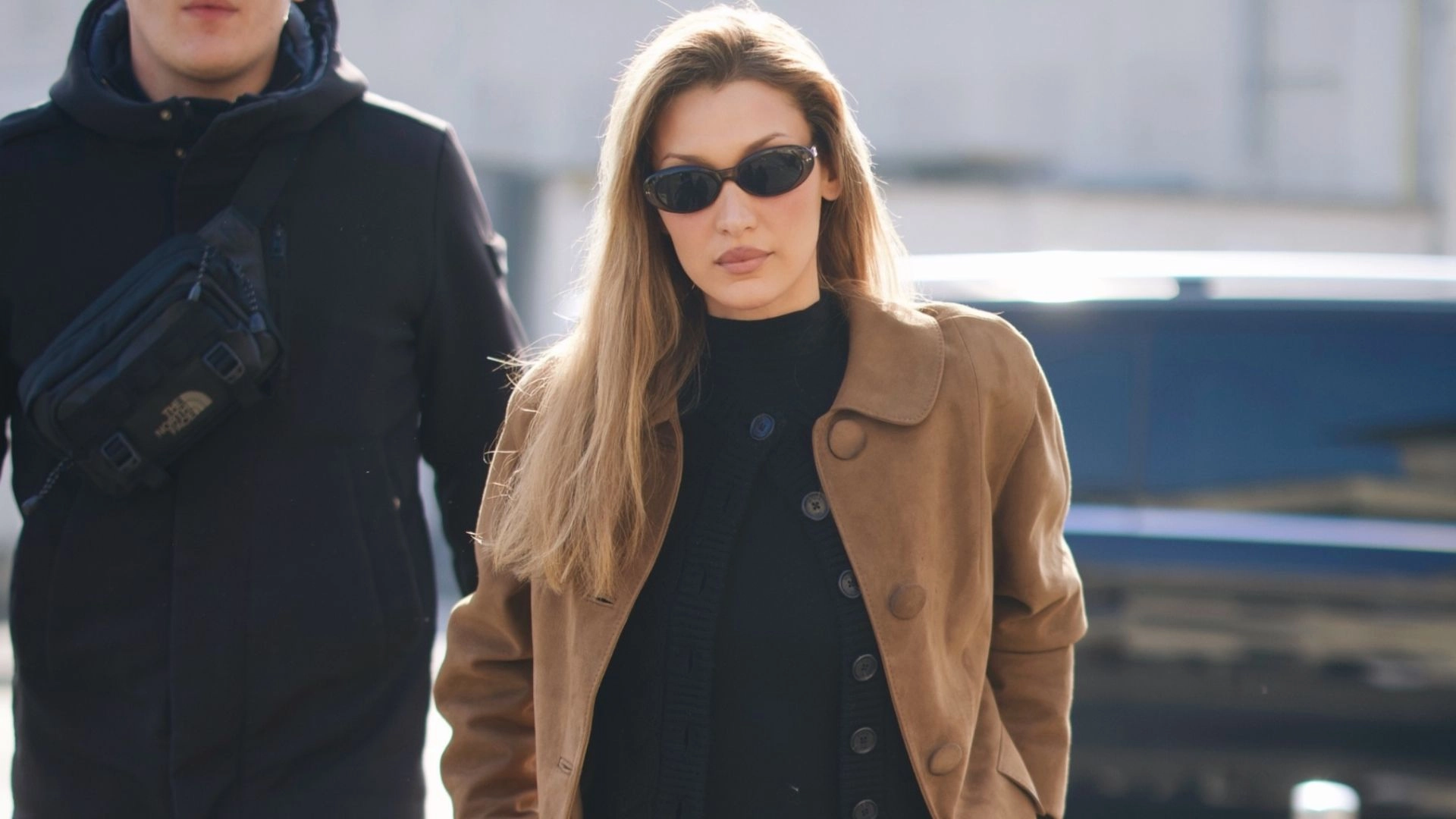 From there, she introduced a little contrast with a suede jacket in a soft tan shade, warming up the all-black base of her top, cardigan and tailored trousers. The interplay between rich suede and sharp tailoring added depth without disrupting the outfit’s minimal mood. Finished with dark sunglasses and a noticeable absence of excess accessories, her look was understated and chic.