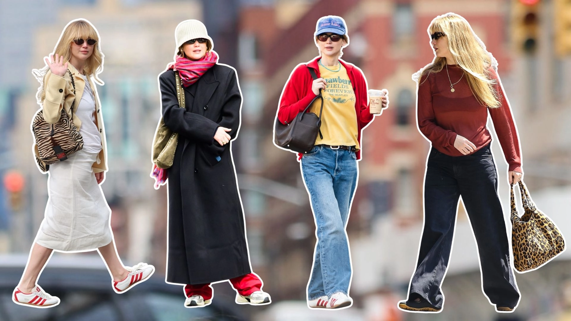Style Notes: Ask anyone who works in fashion, and they’ll tell you that a shortcut to putting together a considered look is to perfect your proportions. This is something that Lawrence knows all too well. Often sporting generously sized pieces like wide-leg tailored trousers, crisp crew-neck t-shirts—if even emblazoned with her favourite track from The Beatles’ Magical Mystery Tour as seen here—and slouchy knitwear in vibrant colourways, the Die My Love actor will always complement these oversized shapes with slim-fit trainers. Lately, it appears she’s preferring the Adidas Tokyo, which were originally introduced in 1964 for the Tokyo Olympics as a track-and-field shoe and feature a scant gum sole.