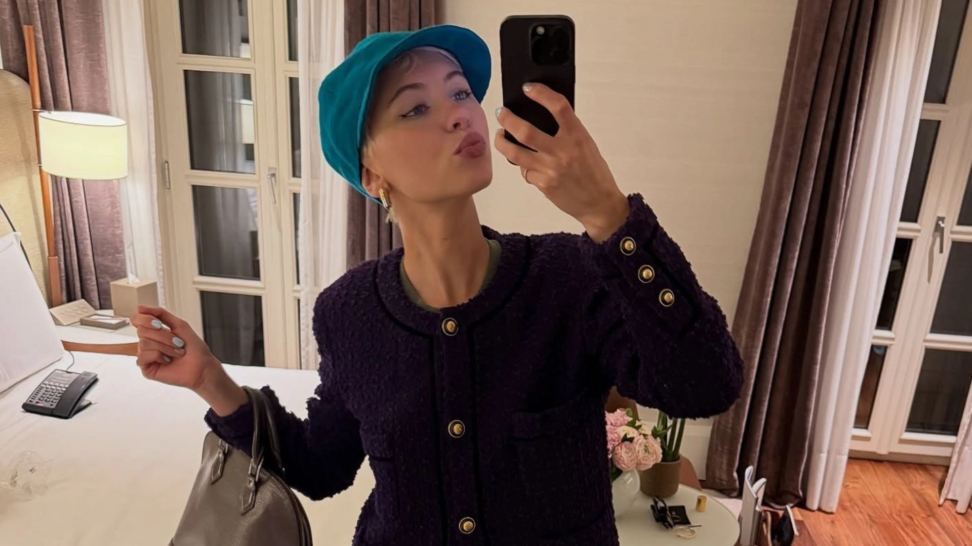 Adding some understated sophistication, Law layered a neat black buttoned jacket over the ensemble, finishing with a striking blue cap and the softly structured Louis Vuitton Alma handbag in a light mushroom hue.