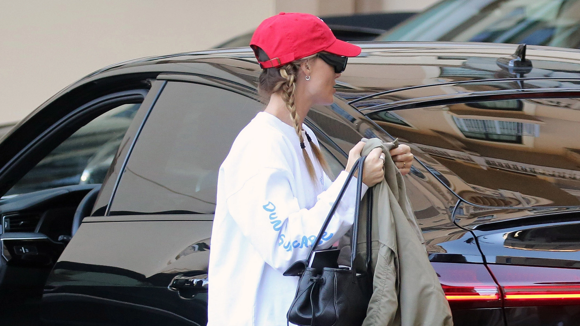 On Margot Robbie: Dune Suncare sweatshirt; Chanel Bag; Loewe Ballet Runner 2.0 Sneakers in Nylon Calfskin ($890)