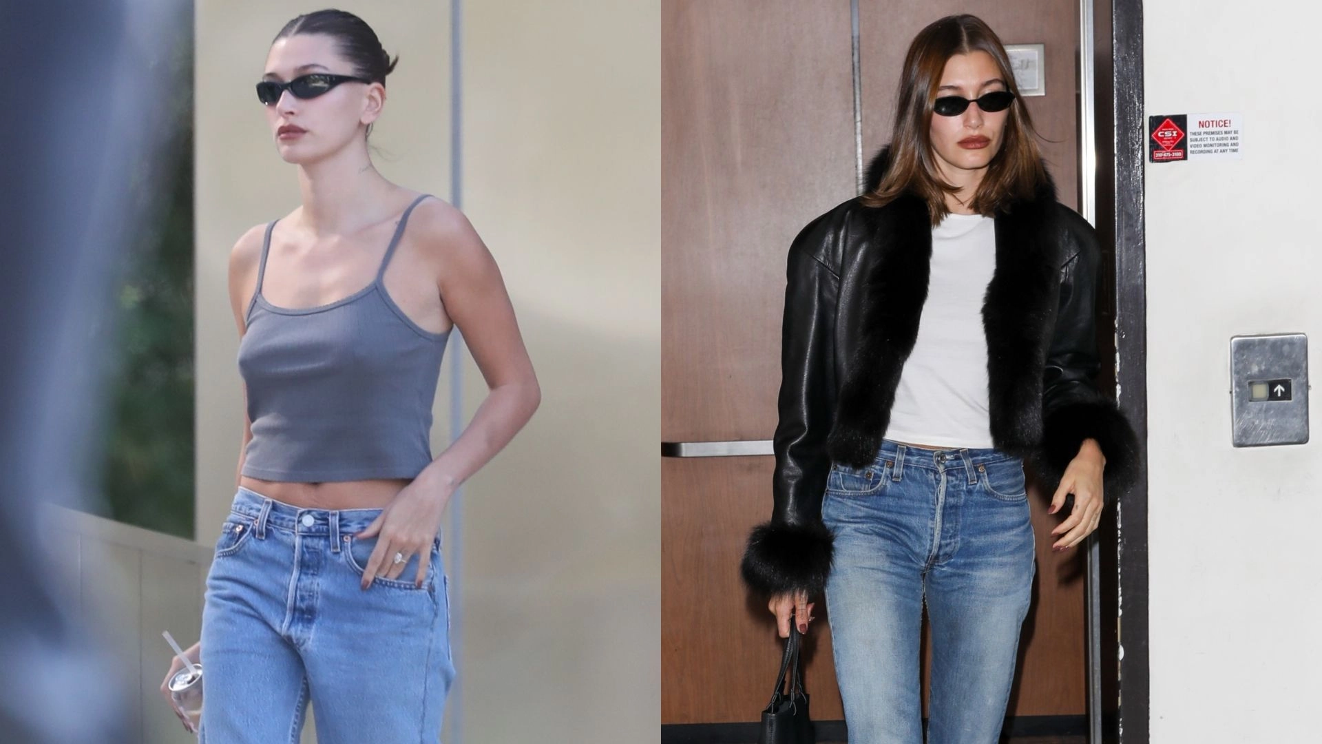 First up, I spotted Hailey in a relaxed daytime look, elevated by a sleek pair of black high-heel shoes. While the jeans themselves have an easy, unfussy feel, the addition of heels sharpened the outfit, lending it a refined edge. The extra height elongates the leg, while the jeans’ clean, structured finish creates a polished silhouette.