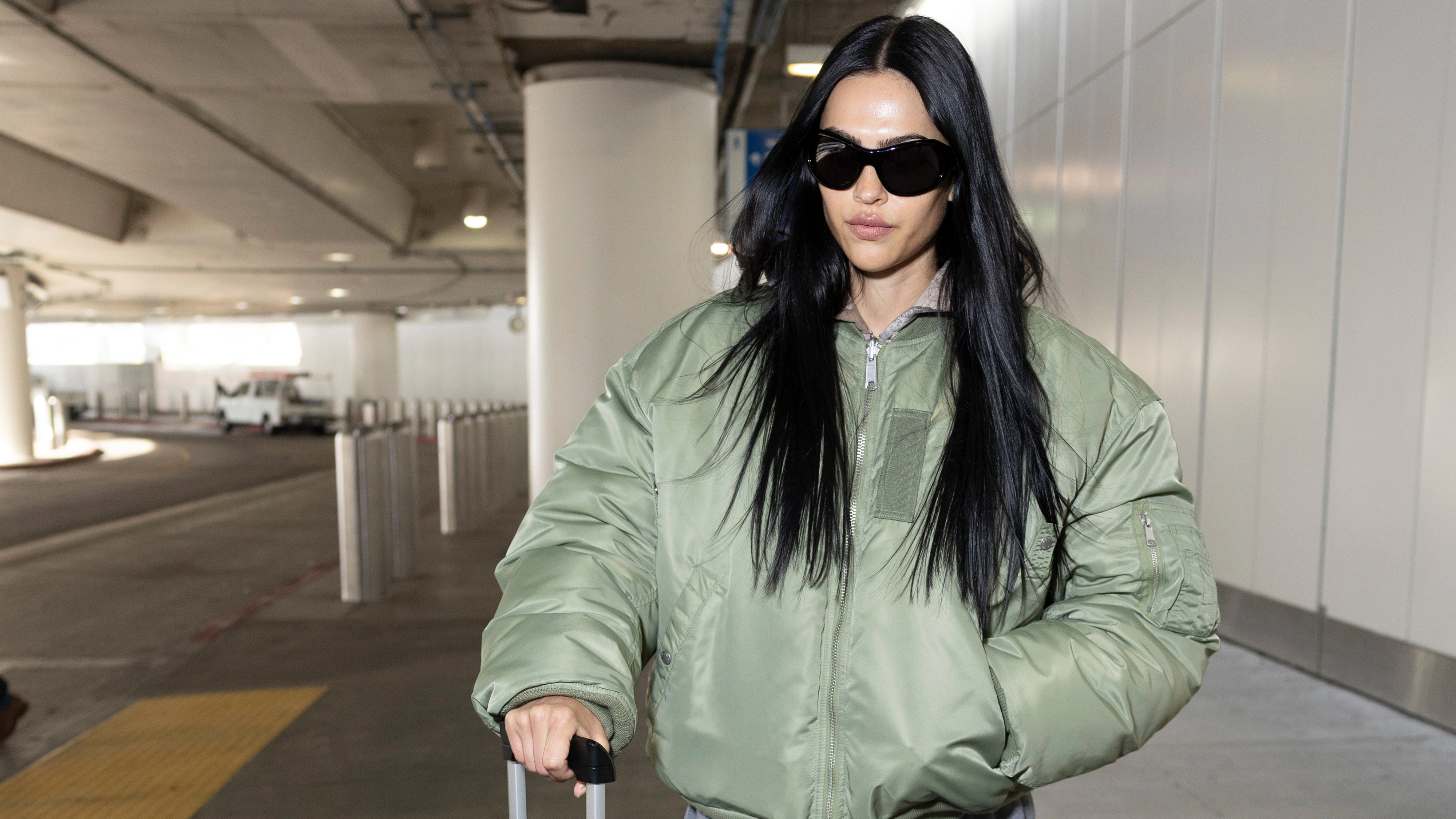 While stepping out before New York Fashion Week, Gray was spotted arriving at JFK Airport in a stylish travel ensemble. She wore a green winter bomber jacket paired with gray sweatpants. On her feet, she opted for black loafers and white socks to keep her ankles warm and protected from the chilly weather. For her accessories, she carried ALO's suede Tranquility Tote and a black suitcase, and she wore oversize sunglasses, which added a trendy touch.