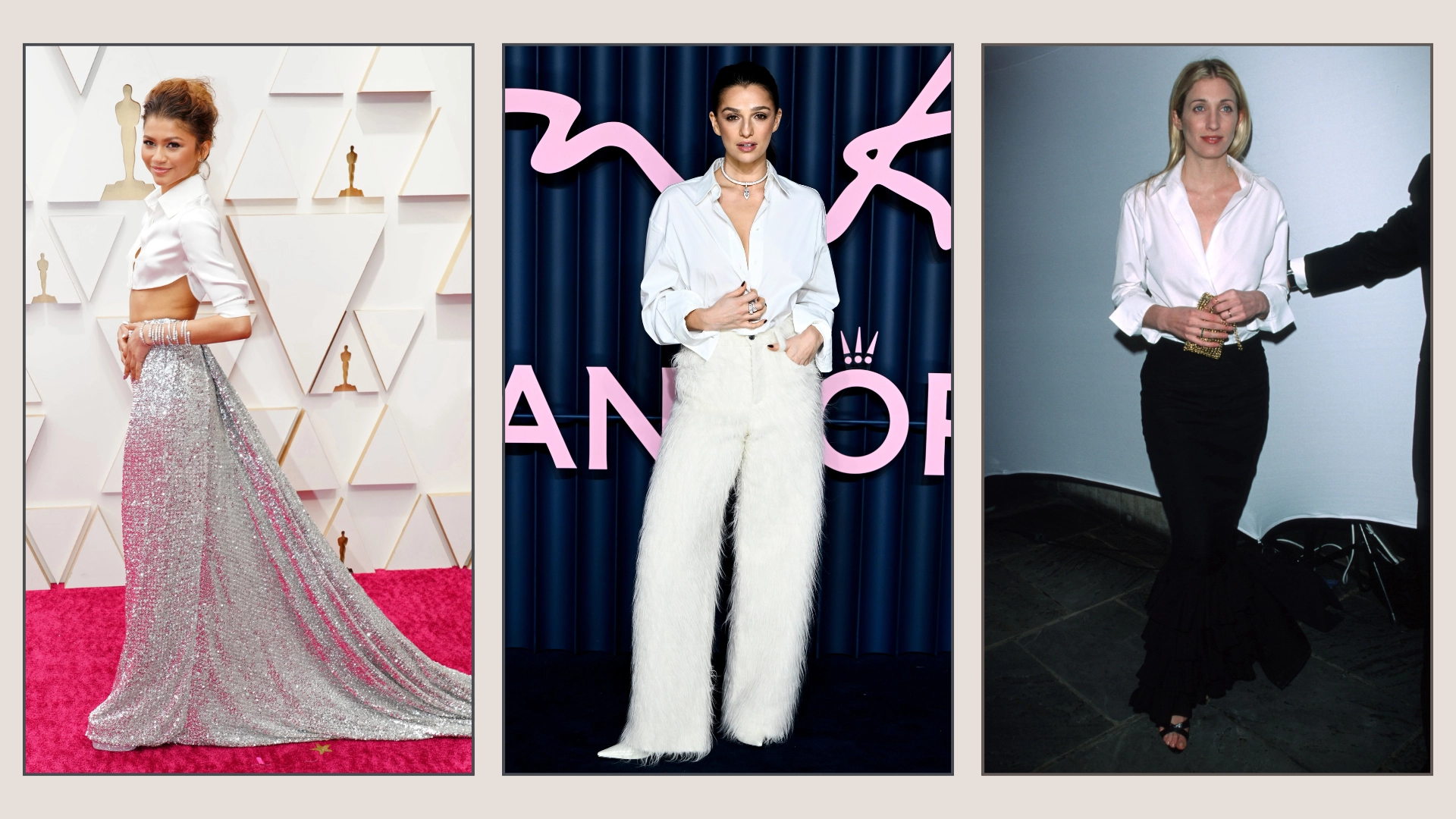 A few years earlier, in 1995, Carolyn Bessette-Kennedy wore a tuxedo-style shirt and mermaid cut black pencil skirt by Yohji Yamamoto to a gala held at the Whitney Museum of American Art, starting this canon of stylish and aspirational ensembles.