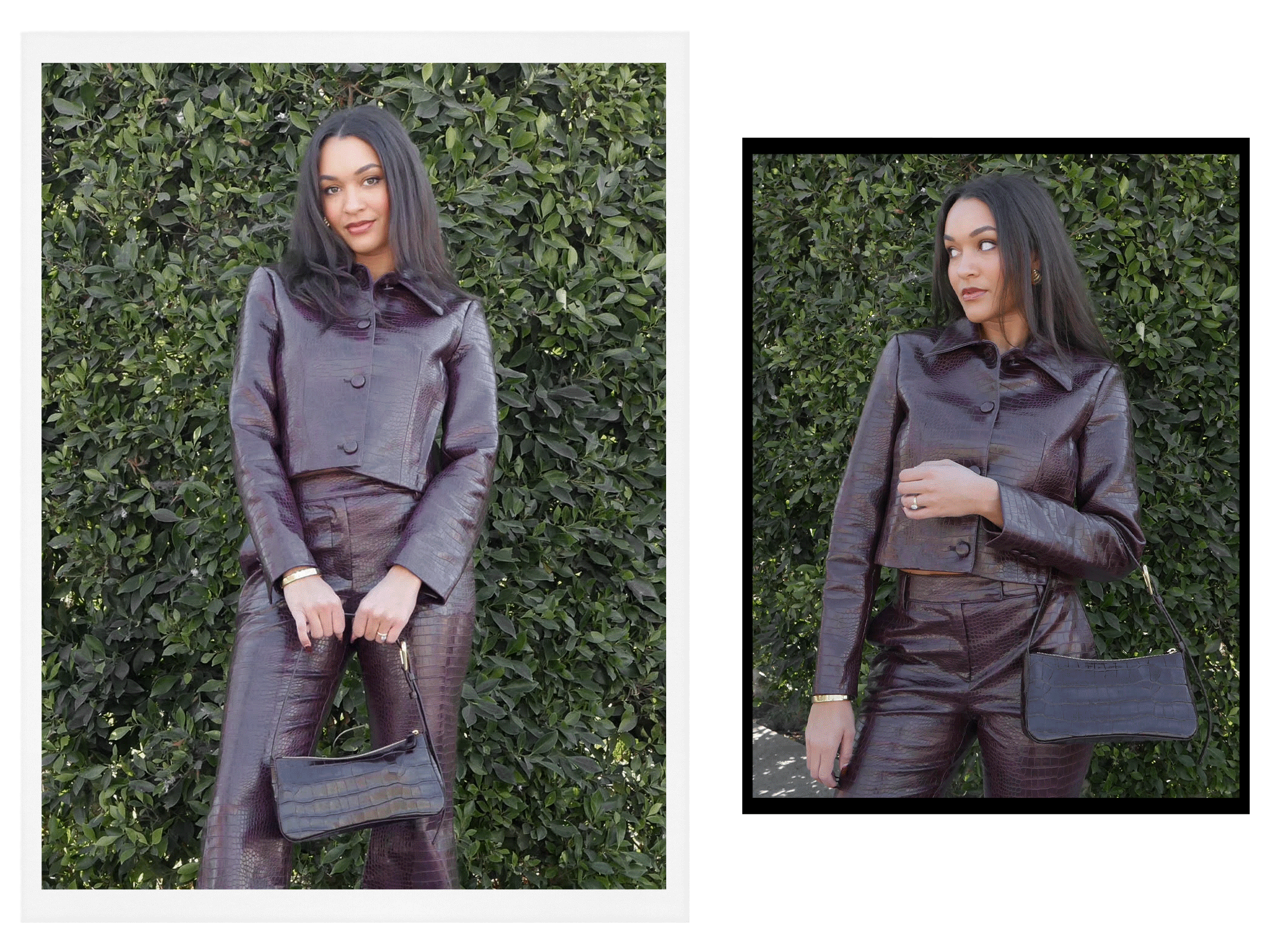 Lauren's choice of Schiaparelli for Smith was nothing short of showstopping. The croc-embossed leather was *chef's kiss*, and I instantly knew I needed a similar vibe in my own wardrobe. I searched high and low to find the perfect inspired-by set to style. I came across this Mango jacket-and-pants combo and it blew me away. The Schiaparelli look featured a pair of thigh-high boots for a maximalist flair, but I went for these pants for a more everyday-friendly situation. And, of course, I had to add a matching bag like the look called for.