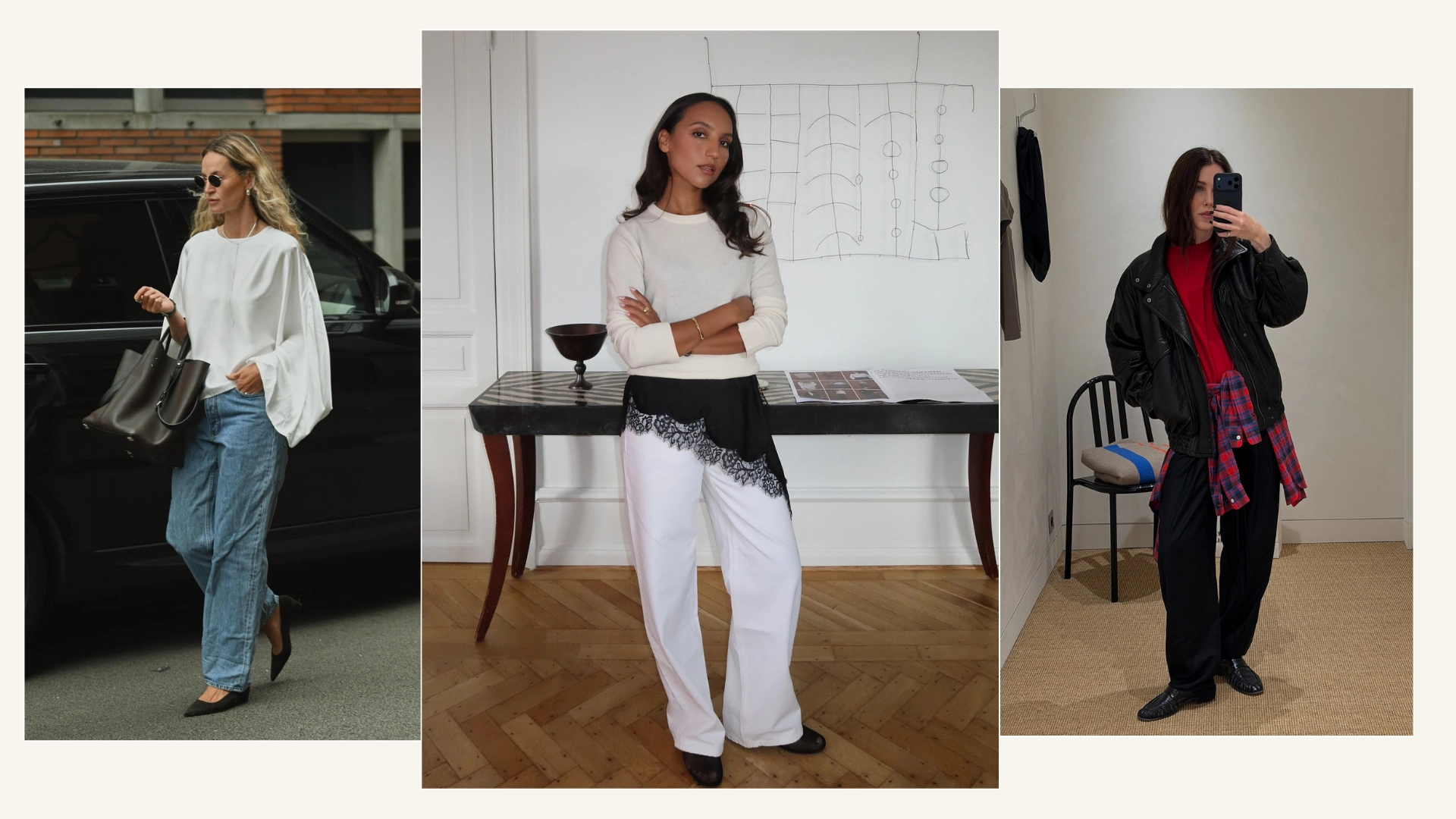 Style Notes: Ingrid’s look is one I’m going to instantly be recreating. A fine knit with a lace trimmed top peering out from underneath brings two different texture elements into it that just work so well together. A crisp white trouser makes it feel so refined and elevated and adding a simple ballet flat ensures the considered approach to the overall look.