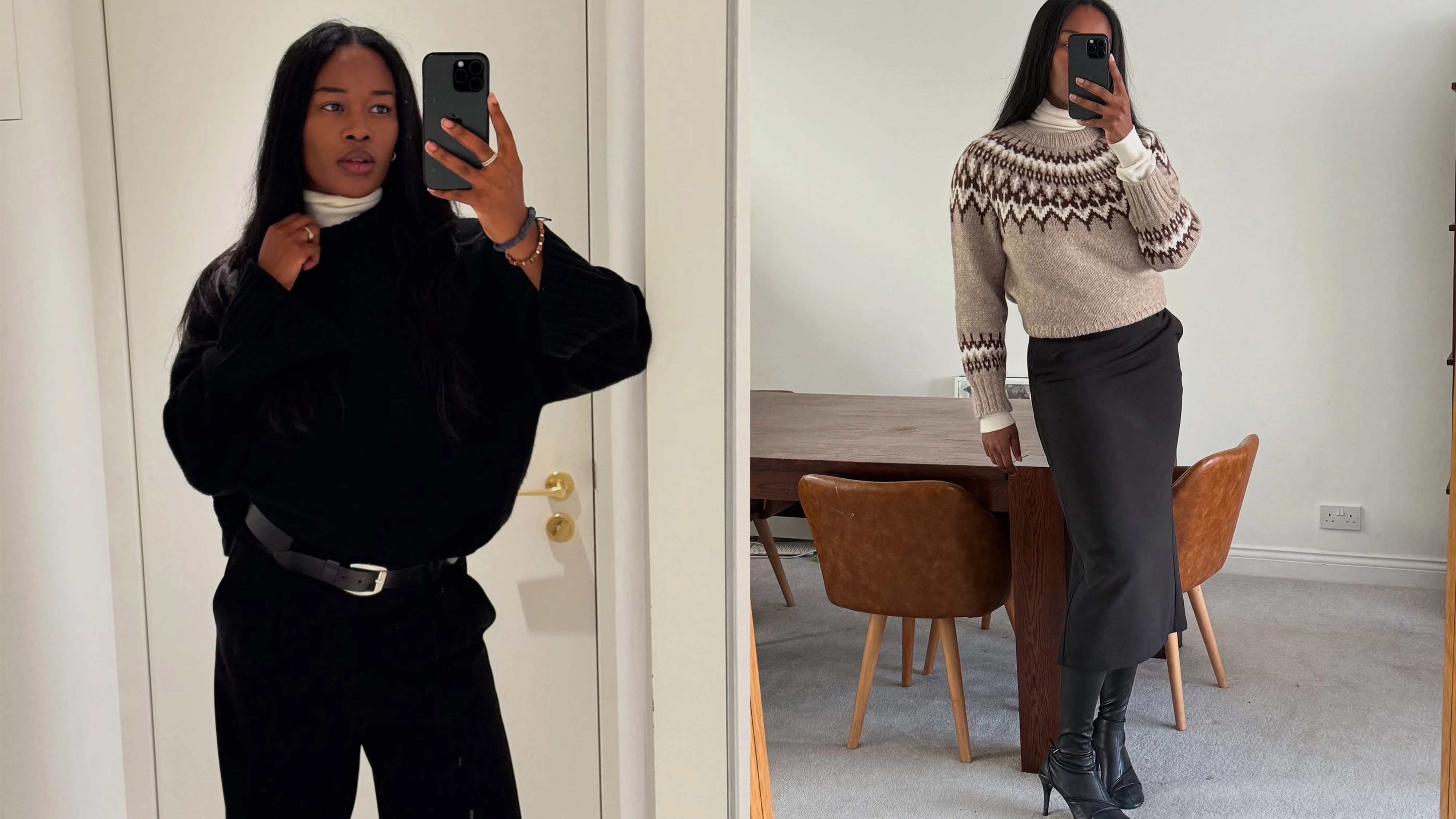 The first time I saw this styling method and felt spurred to copy it was on London-based creator Marilyn Nwawulor-Kazemaks, who is always ahead of trends and has the kind of everyday style that makes you hit the little save button on every Instagram post. In the span of one carousel post, she wore two different turtleneck-under-sweater outfits, one with an all-black ensemble, and another with a Fair Isle sweater and midi skirt. By seeing it two ways, I started to understand the versatility of this hack. It works in every scenario for winter, a season that can be tricky to dress for. It doesn't hurt that it's also quite practical, especially when temperatures really start to dip.