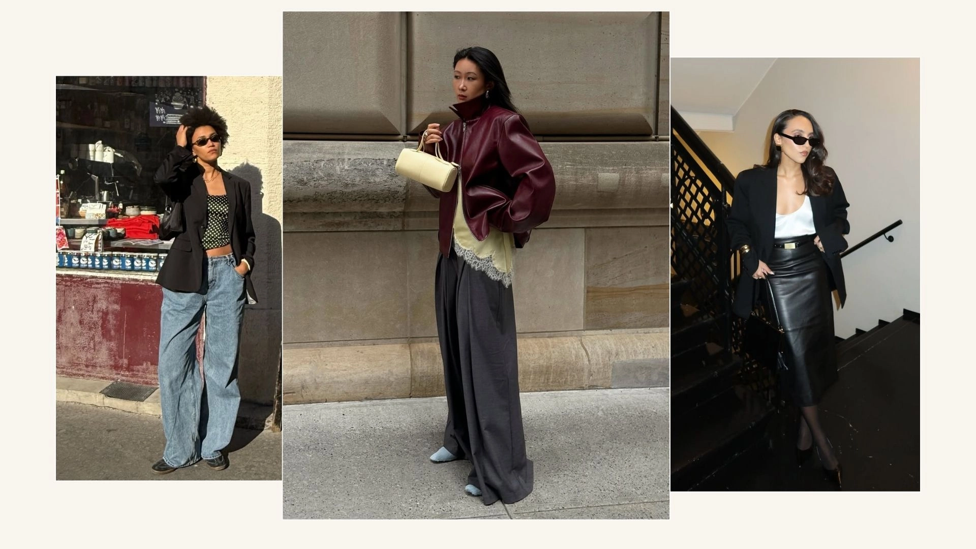1. Satin Top + Leather Bomber + Wide-Leg Trousers