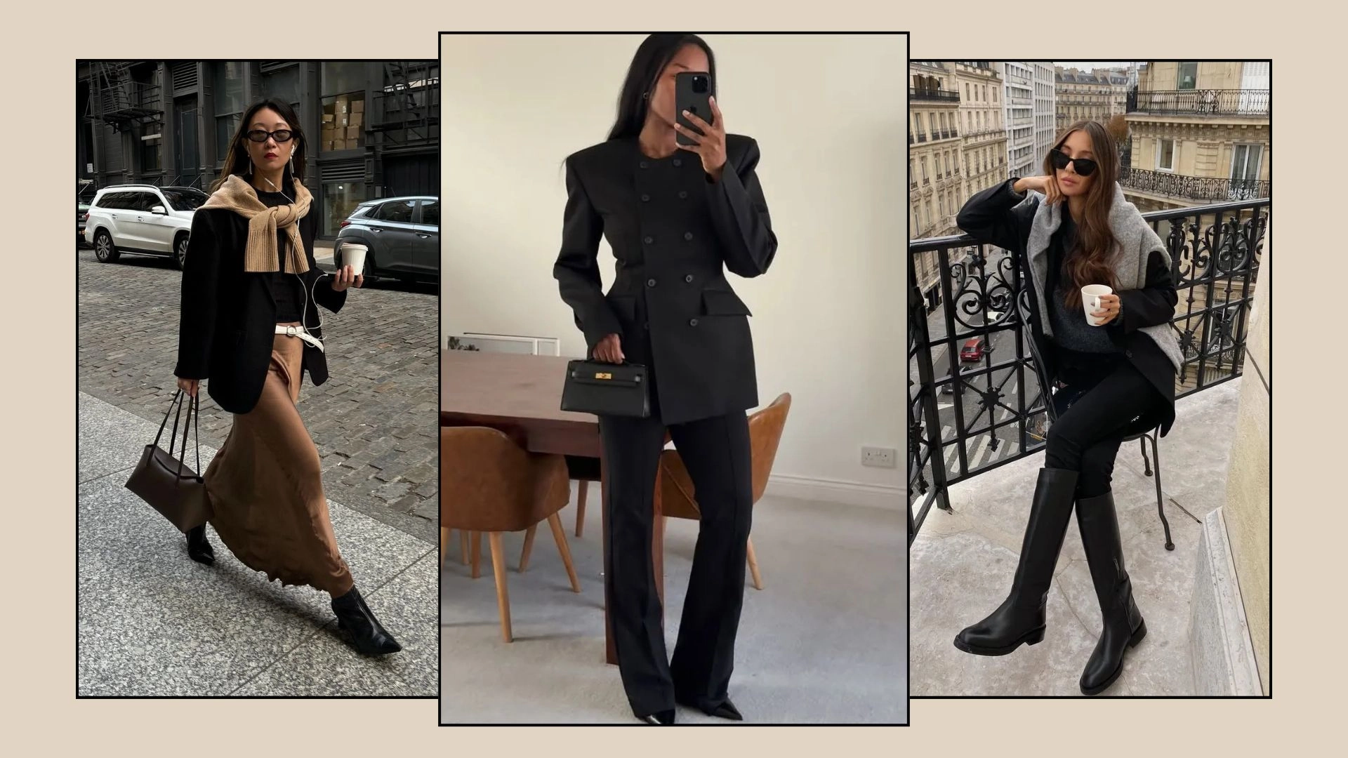 Style Notes: This is very much the "off-duty, but considered" look I've been seeing on my morning commute a lot lately. Riding boots made a strong comeback last year, and they've stayed firmly in rotation thanks to their practicality and long-line silhouette. Worn with leggings and a soft knit draped over the shoulders, the look strikes a balance between practicality and intention. Adding a clean-cut blazer on top pulls everything together, making it one of the most wearable black blazer outfits for truly busy days.