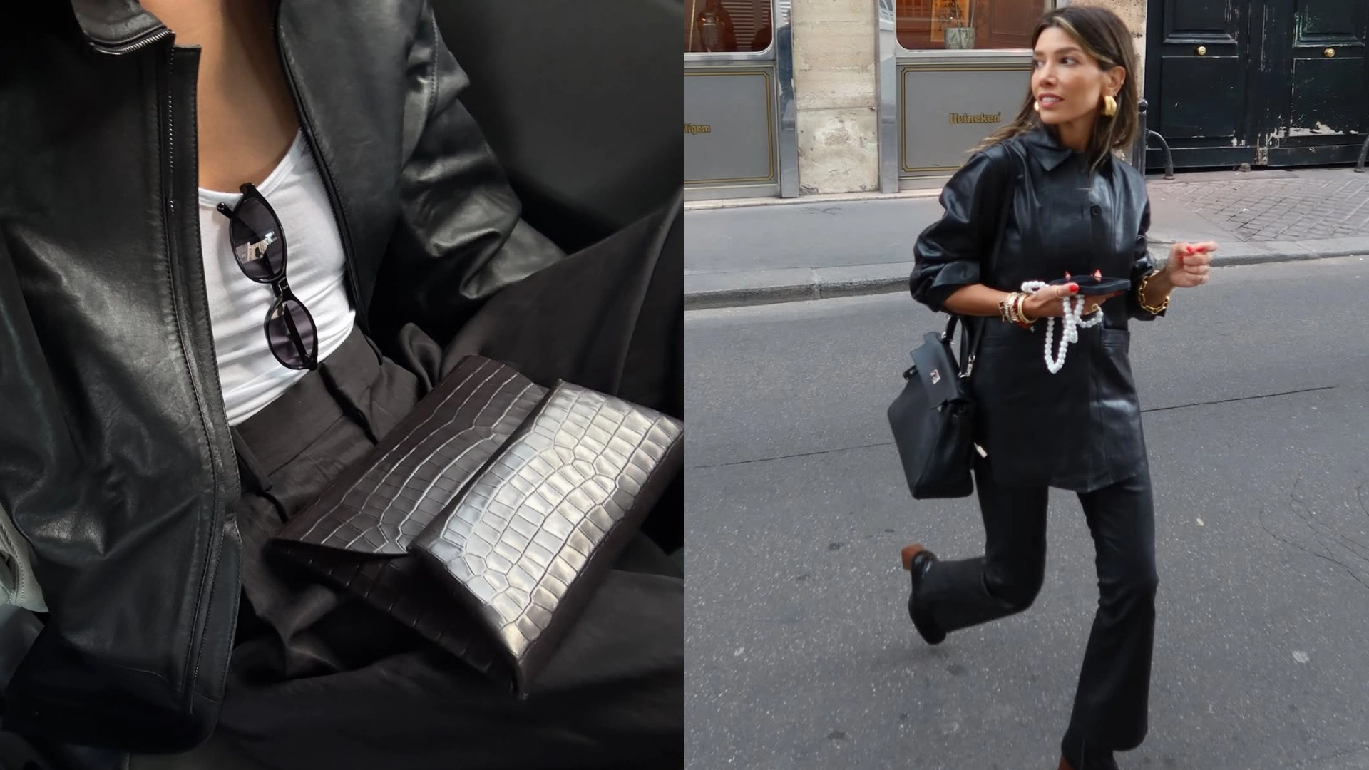 Get the look: Collared leather jacket + Low-cut black top + Loose black trousers + Pointed-toe heels