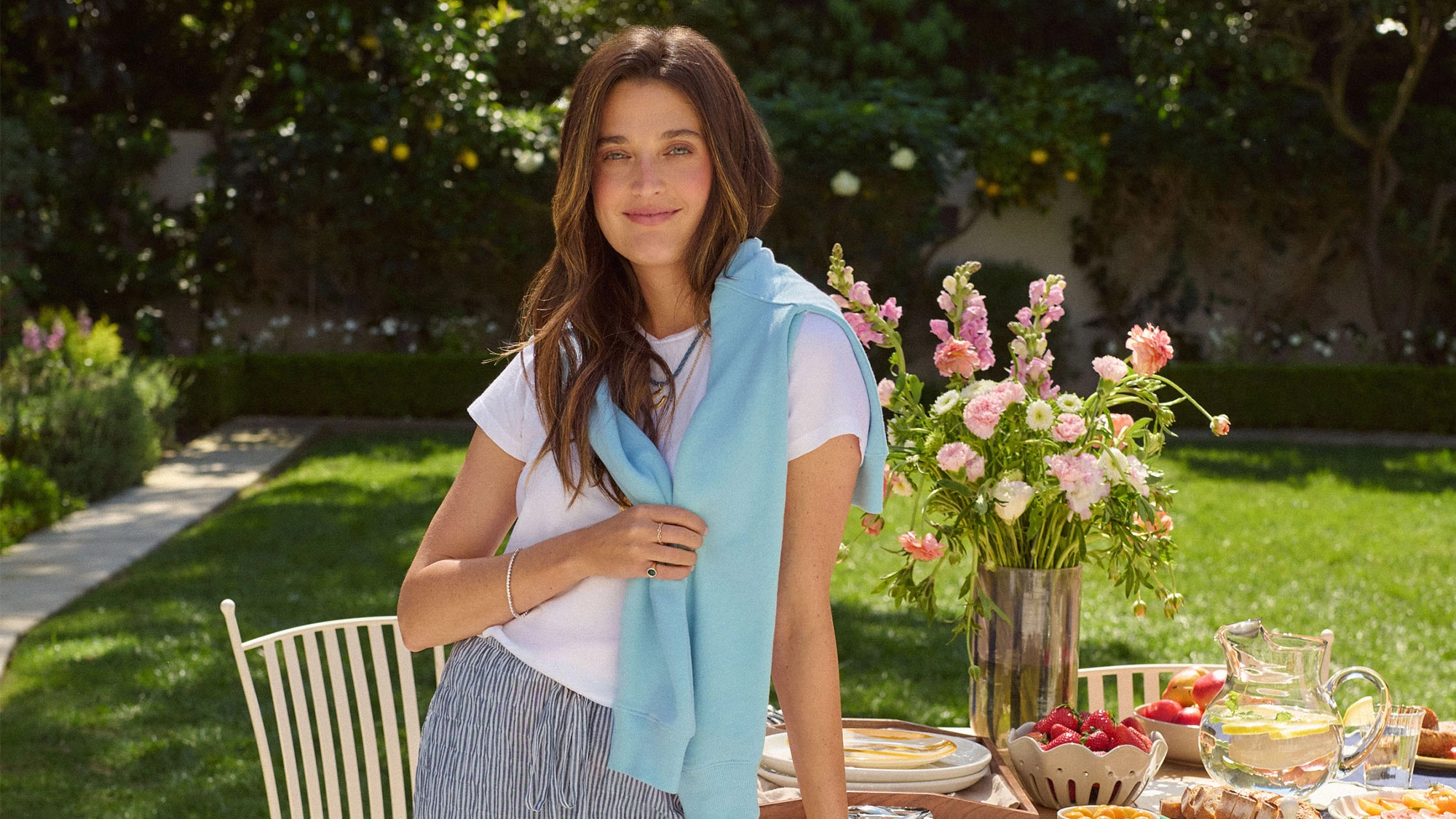 The collection features everything from adorable dresses to cute jackets—items that would seamlessly work into a curated spring and summer wardrobe. "These are exactly the types of pieces that make up my spring and summer capsule wardrobe. Mini and midi dresses, lightweight cotton pants, and skirts, easy tees, sets, and layers you can throw on without overthinking. Everything feels effortless but still put together," Goldman explained. Below you'll see how Goldman styles the pieces in California. And yes, you can shop the pieces too.