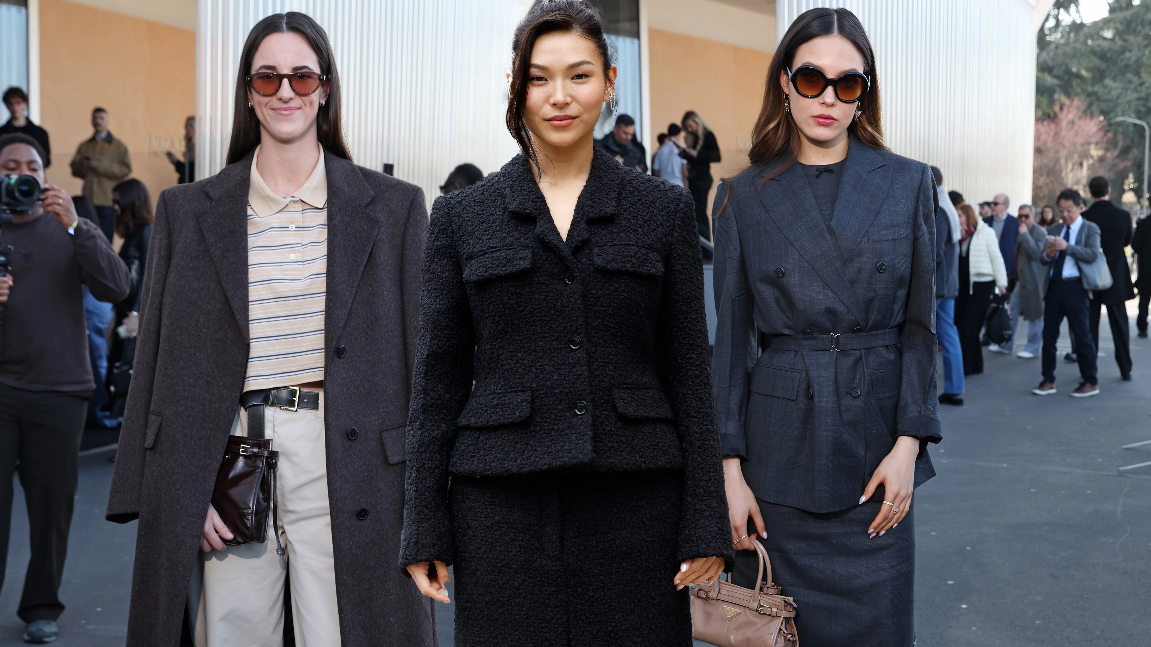 At Prada's F/W 26 show in Milan, the front row wasn't just TV darlings, Oscar-winning actresses, and TikTok phenoms. Two of the biggest names in women's sports also got a close-up view of next season's offering: Caitlin Clark and Eileen Gu. Clark, whose relationship with the Italian brand began when she became the first basketball player ever to be dressed by Prada on draft night, wore a striped polo, khaki-colored pants, and a brown, single-breasted coat for the occasion, finishing off the ensemble with a pair of brown sunglasses that matched her suede pumps and leather clutch. Gu, who only had a short journey to Fondazione Prada from the 2026 Winter Olympics, where she added to her collection of gold medals, donned a charcoal-colored dress and a matching, belted blazer. She, too, wore oversize sunglasses, as well as a tan top-handle bag, gray socks, and burgundy heels.