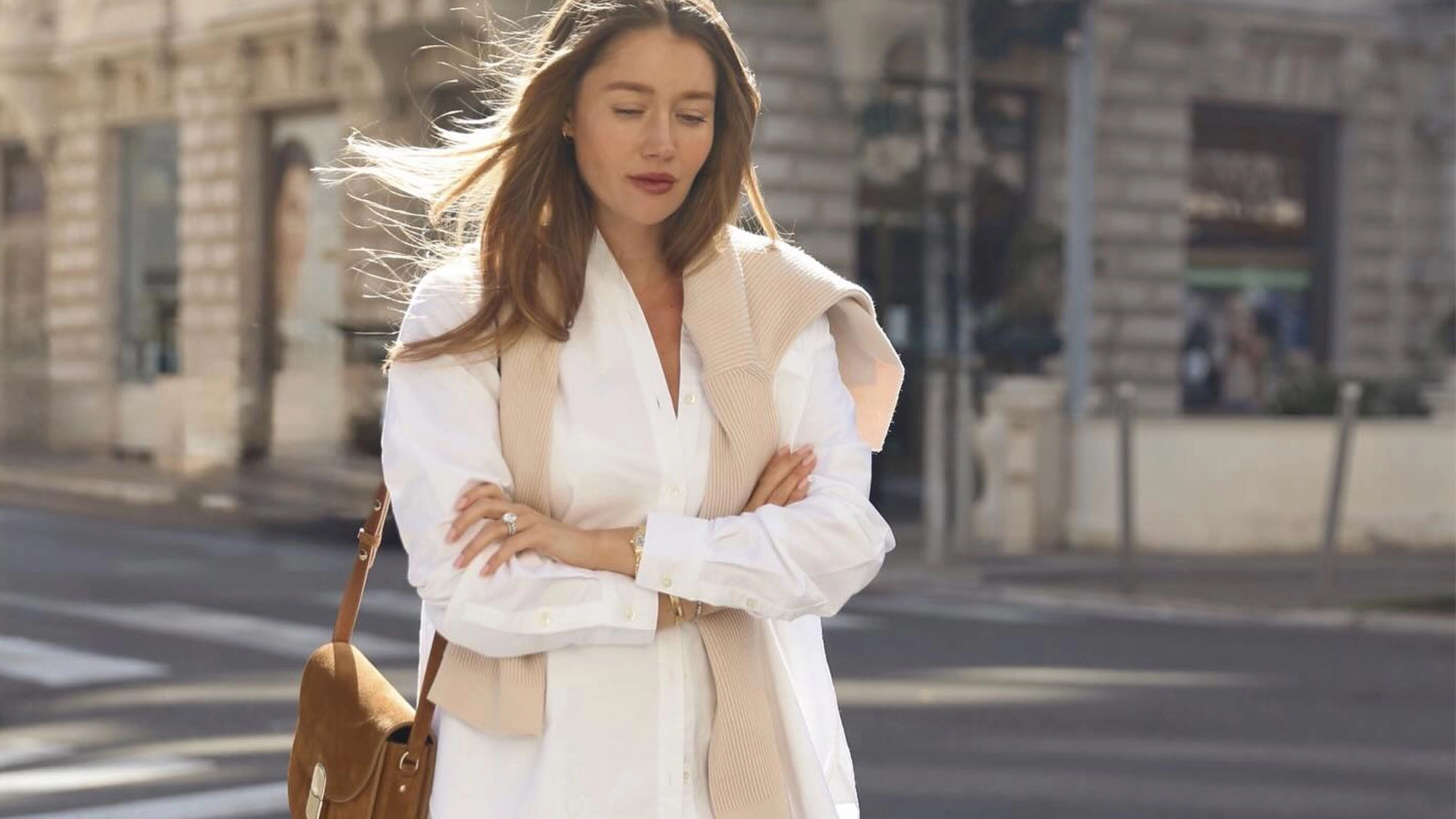 This outfit is lovely for spring, featuring a relaxed white button-up shirt and a sweater draped over the shoulders, styled with satin pants. While heels certainly would work here, the ballet flats are a nice switch-up.