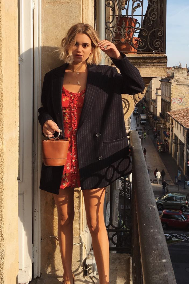 Layer an oversized blazer on top of a colorful mini slip dress.