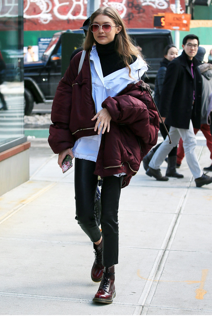 Style Notes: Gigi is a big fan of Dr. Martens, but this is our favourite of her DM looks to date. She paired her cherry-red boots with a pair of cropped black trousers to show off the entire boot, and then wore an oversize Vetements bomber in the same red as her Docs.