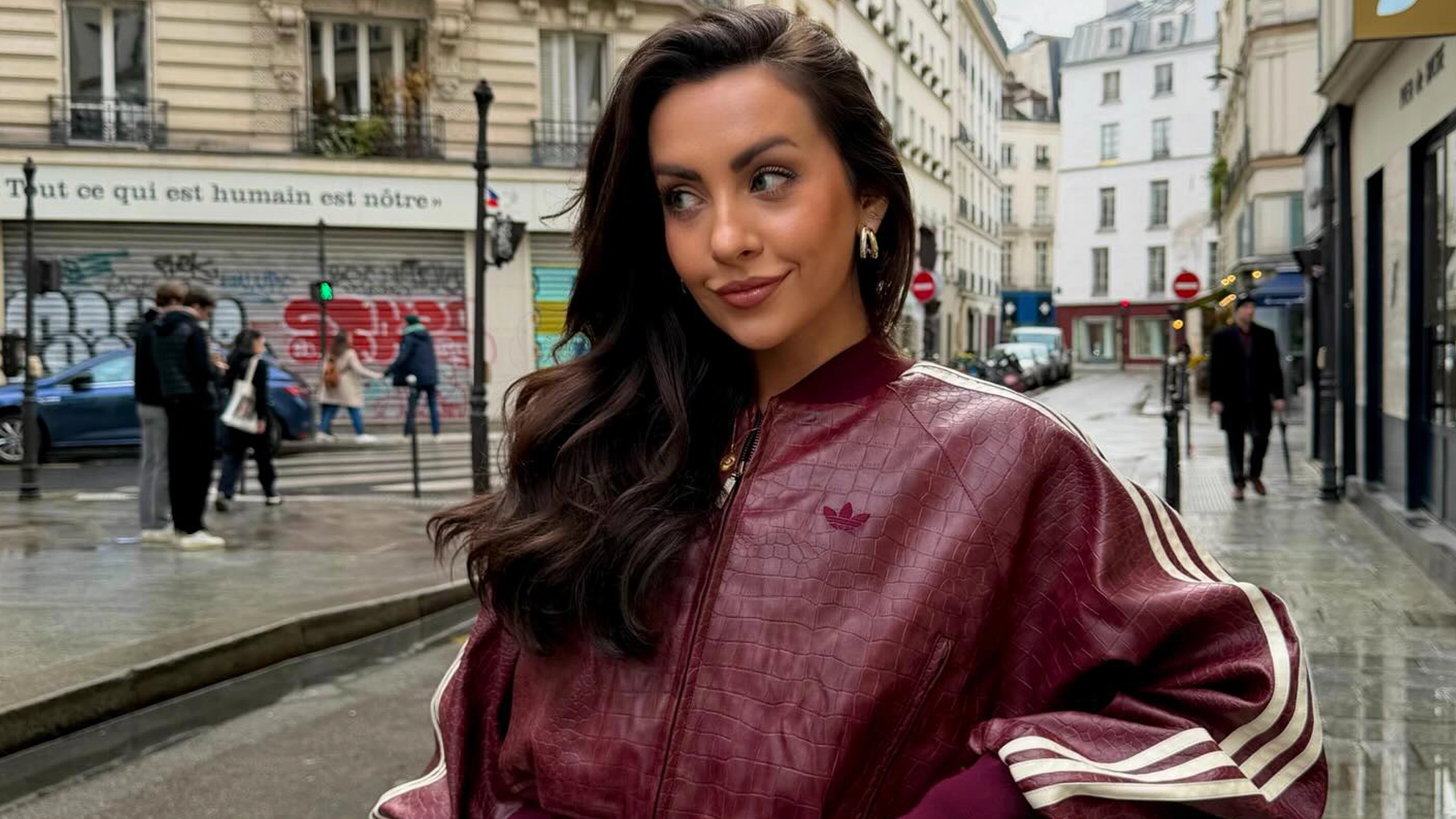"I like to show my personal style on a first date while keeping it fun and flirty. My go-to outfit formula in the winter is leather pants, platform Dr. Martens, and a cute top that shows some skin (but not too much). Accessorizing is the key to keeping the outfit true to my style. I always wear bright red lipstick, a standout piece of jewelry—either a gold necklace or statement earrings—and a mini purse to keep the look sophisticated and feminine. Lastly, I like to wear a bright-colored coat for a fun pop of color to complete the outfit." — Emma Greis