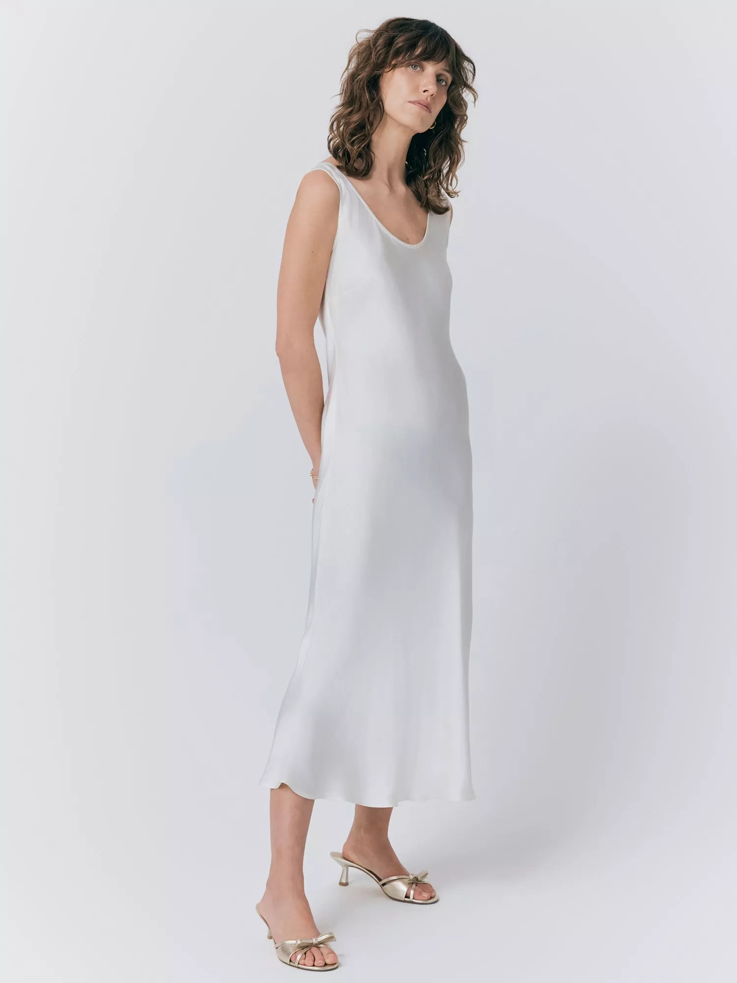 Style Notes: When warm weather rises, our interest in layering on multiple pieces wanes. Marianne Smyth of @smythsisters knows this all to well, showcasing a breezy all-white outfit for women can be as simple as throwing on a beautiful dress. This silhouette is a more mature version of the slip dress trend that she wore on holiday in Palma de Mallorca, elevating the silhouette slightly by swapping thin bucatini straps for a rounded scoop neckline.