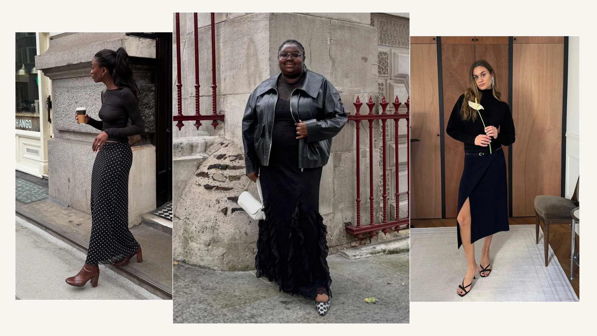 1. Dinner First-Date Outfit: Midi Skirt + Black Jumper + Heels