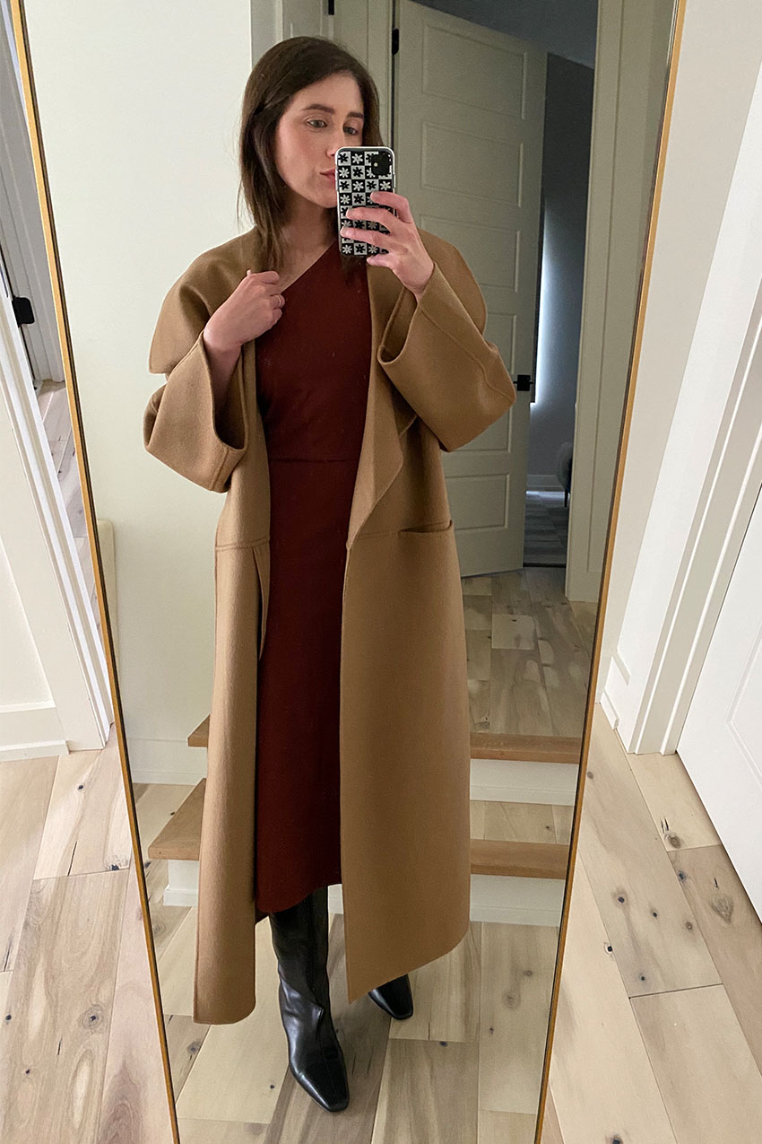 "For fall, you miss the full effect of the dress since the sleeves are probably going to be covered up, but it's still a great fall-friendly style, thanks to the color. I went with an oversize camel coat and knee-high boots, which I think give the dress an elegant look."