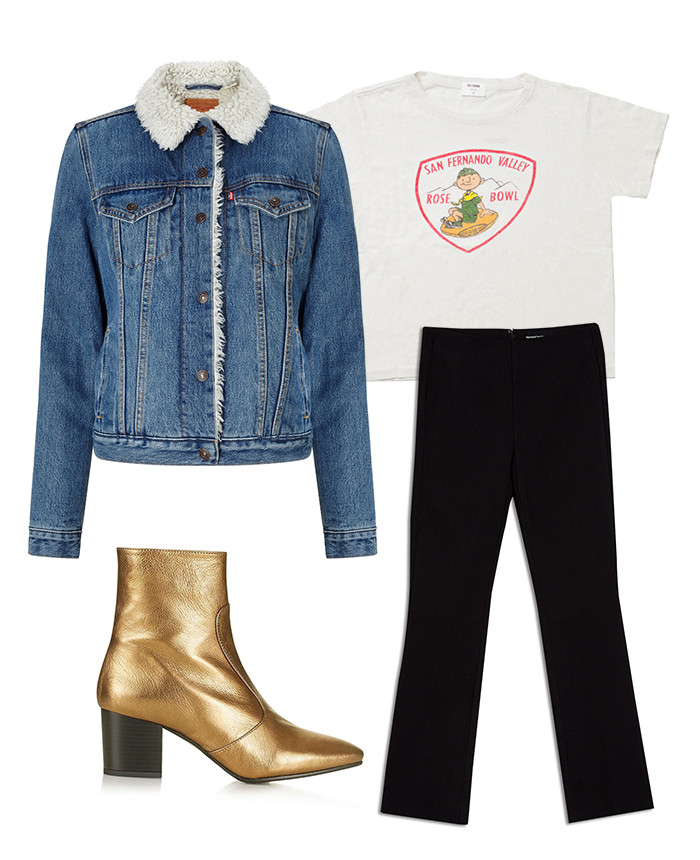 Pictured Above: Levi's Authentic Sherpa Trucker Jacket ($148); RE/DONE The San Fernando Valley Camp Tee ($85); Who What Wear Cropped Flare Pants ($30); Topshop Mustard Western Boots ($140).